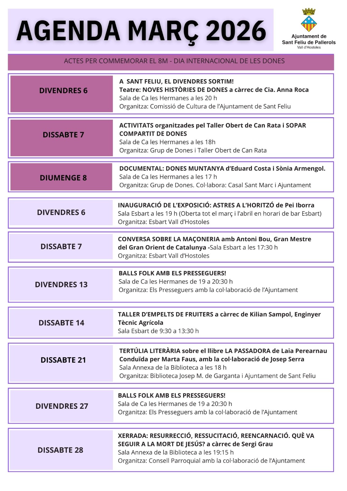 Agenda Agenda març 2026 De l'1 al 31 de març 2026 Març, marçot, s’emporta la vella de la vora del foc, i la jove si pot. Agenda d’activitats del mes de març 2026 < Entrada Anterior