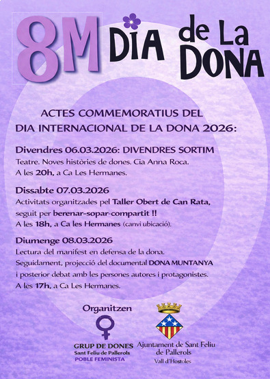Arriben els actes del #8M a Sant Feliu de Pallerols! Un cap de setmana ple de cultura, reflexió i comunitat per commemorar el Dia Internacional de la Dona. DIVENDRES 06/03/2026: DIVENDRES SORTIM Teatre – “NOVES HISTÒRIES DE DONES” – Cia. ANNA ROCA – 20h. Sala Ca Les Hermanes DISSABTE 07/03/2026 Activitats organitzades pel Taller Obert […]