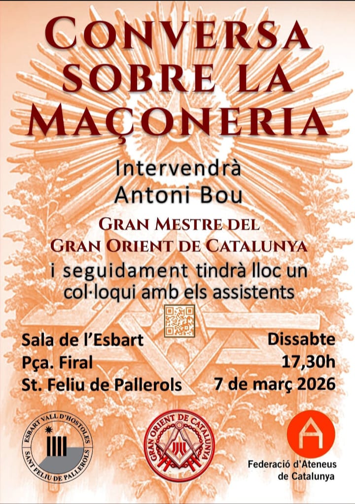 7 de març – 17:30h – Sala de l’Esbart Amb la intervenció de Antoni Bou, gran mestre del Gran Orient de Catalunya
