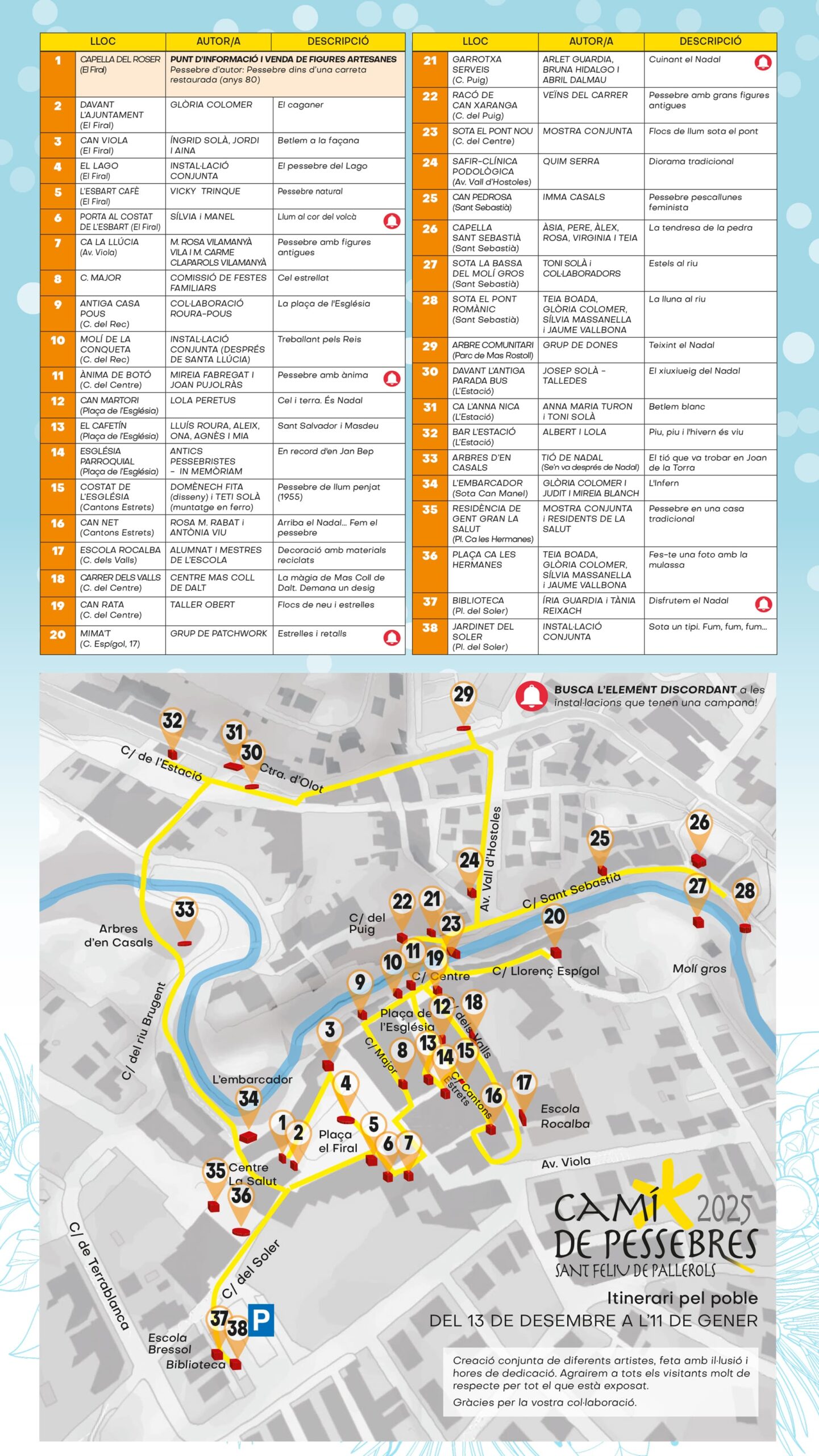 INAUGURACIÓ: Dissabte dia 13 a les 5 de la tarda a l’Església Parroquial. Tot seguit, ruta per les instal·lacions, amb música i cançons, des de la plaça de l’Església fins a Ca Les hermanes on es servirà xocolata per a tothom.