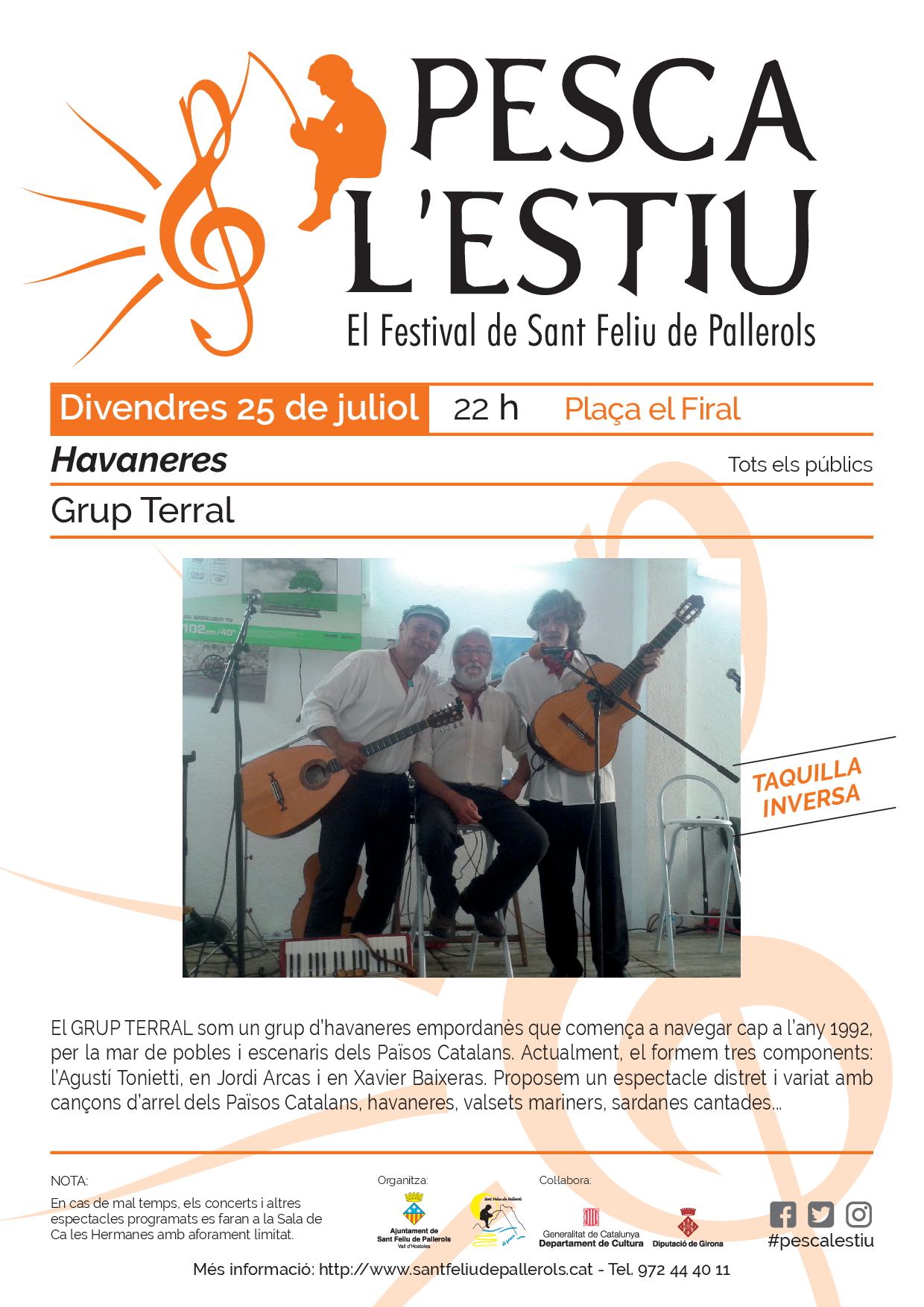 El GRUP TERRAL som un grup d’havaneres empordanès que comença a navegar cap a l’any 1992, per la mar de pobles i escenaris dels Països Catalans. Actualment, el formem tres components: l’Agustí Tonietti, en Jordi Arcas i en Xavier Baixeras. Proposem un espectacle distret i variat amb cançons d’arrel dels Països Catalans, havaneres, valsets mariners, sardanes cantades…
