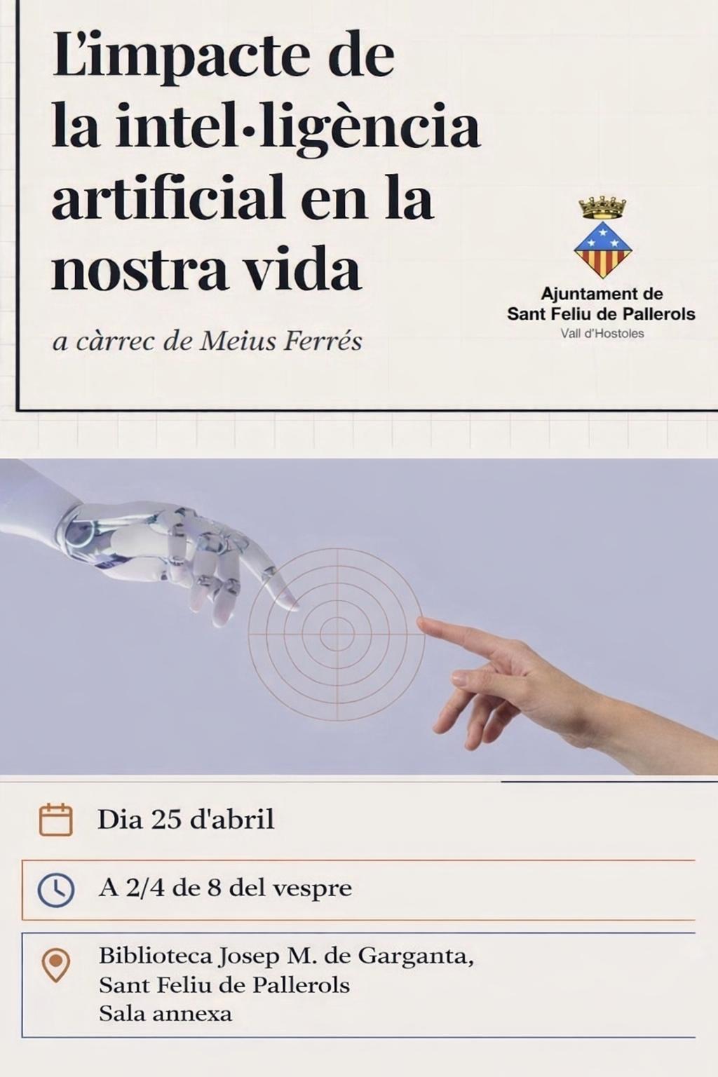 Agenda L’impacte de la intel·ligència artificial en la nostra vida 25 d'abril de 2026 | Sala Annexa Biblioteca Dissabte dia 25 d’abril, a 2/4 de 8 del vespre a la Sala Annexa de la Biblioteca Xerrada a càrrec de Meius Ferrés < Entrada AnteriorEntrada Posterior >
