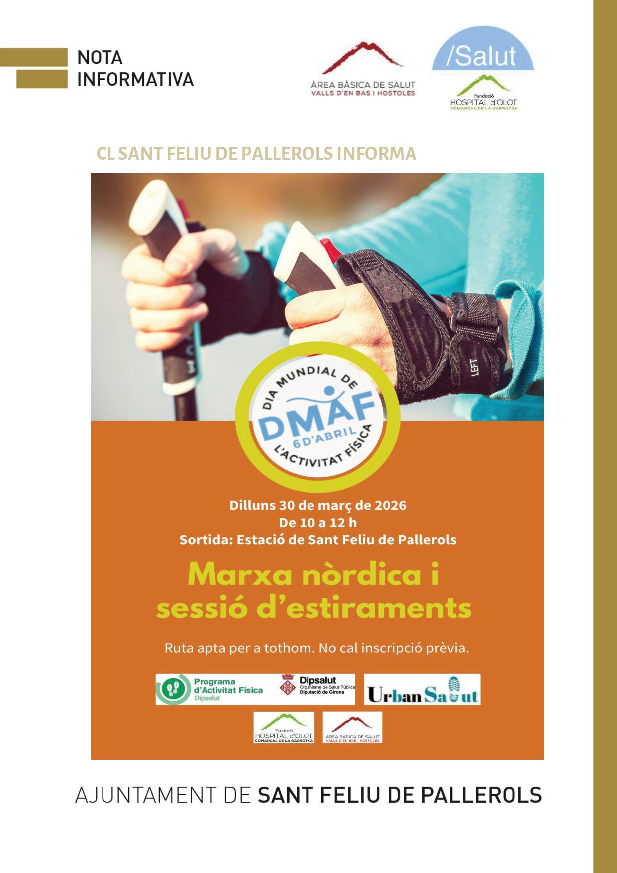 El proper dilluns dia 30 de març de 10 a 12h, en motiu del Dia Mundial activitat Física (DMAF), el 6 d’abril, amb l’objectiu de sensibilitzar a la població sobre la importància de mantenir-se actius i reduir el sedentarisme per millorar la salut i el benestar general, seguint les recomanacions de l’Organització Mundial de la Salut (OMS), la Fundació Hospital d’Olot i comarcal de la Garrotxa juntament amb l’Àrea Bàsica de Salut de les Valls d’en Bas i Hostoles, organitzen una marxa nòrdica i sessió d’estiraments que començarà a l’Estació de Sant Feliu de Pallerols.