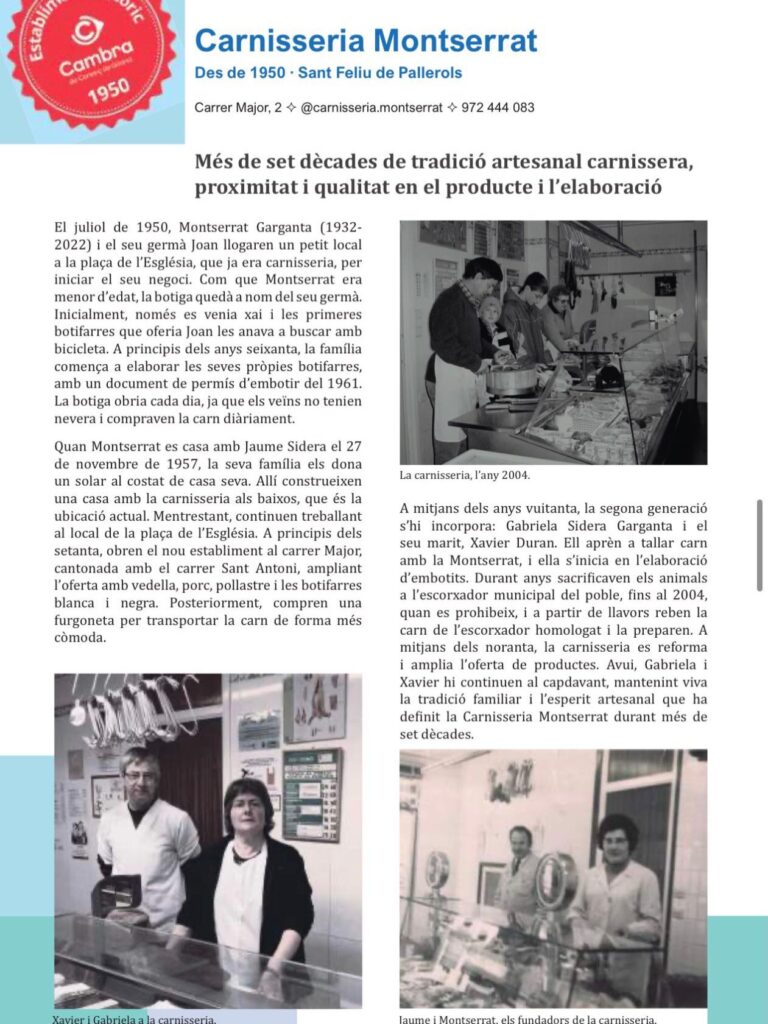 Des de l’any 1950, aquest establiment del Carrer Major ha estat un pilar del comerç de proximitat i qualitat a Sant Feliu de Pallerols. Durant l’entrega, la família Montserrat ha rebut: