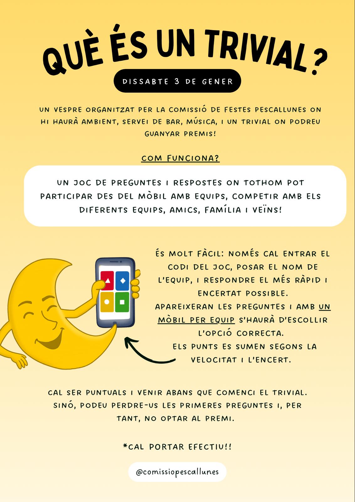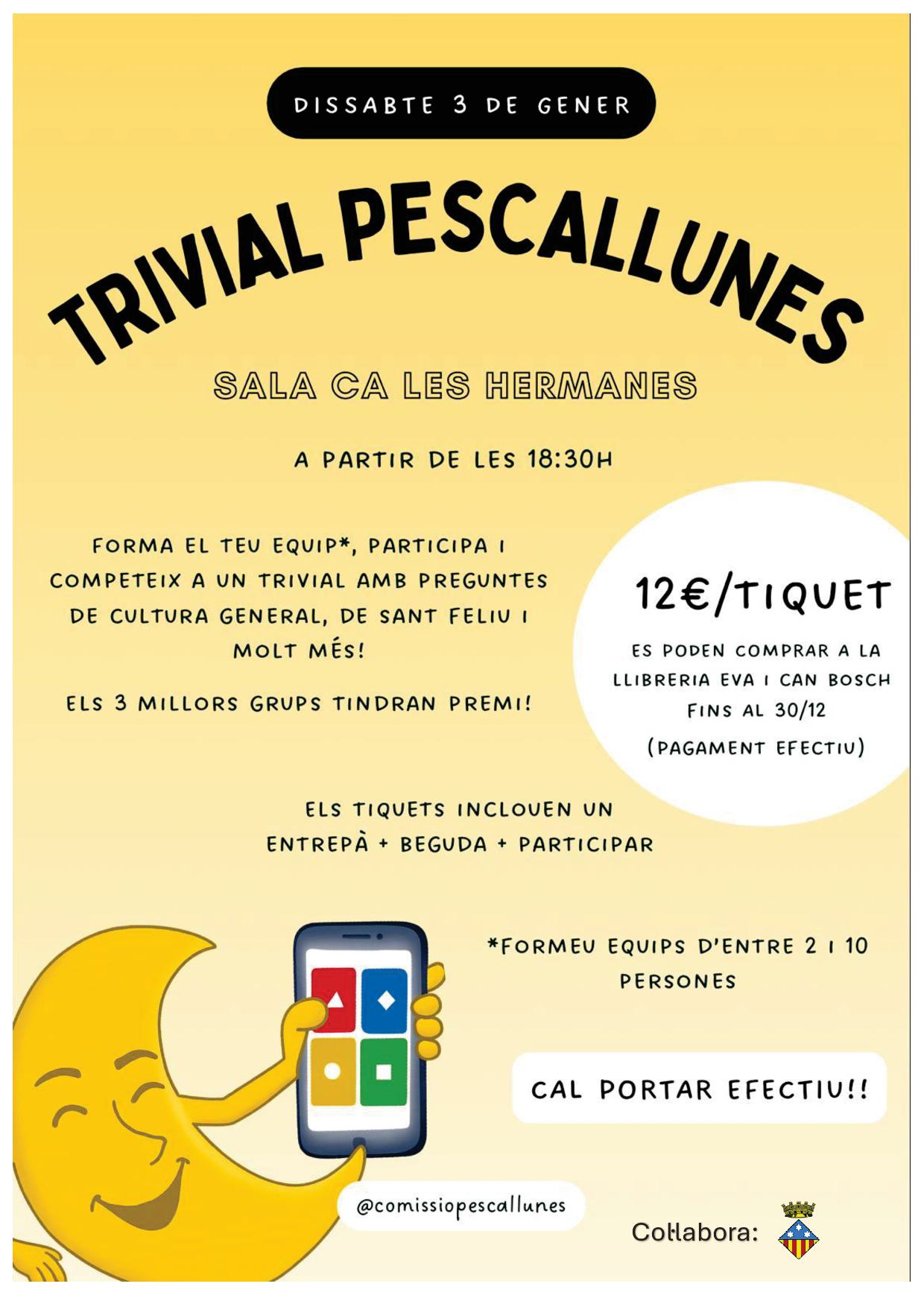 Un vespre organitzat per la COMISSIÓ DE FESTES PESCALLUNES on hi haurà ambient, servei de bar, música i un trivial on podreu guanyar premis!