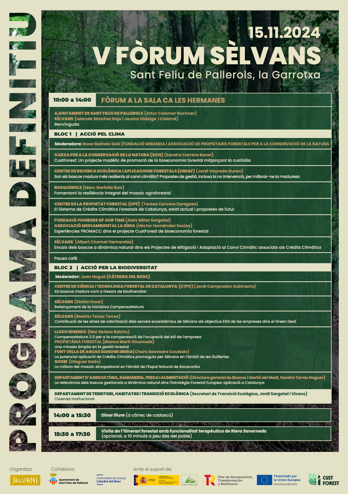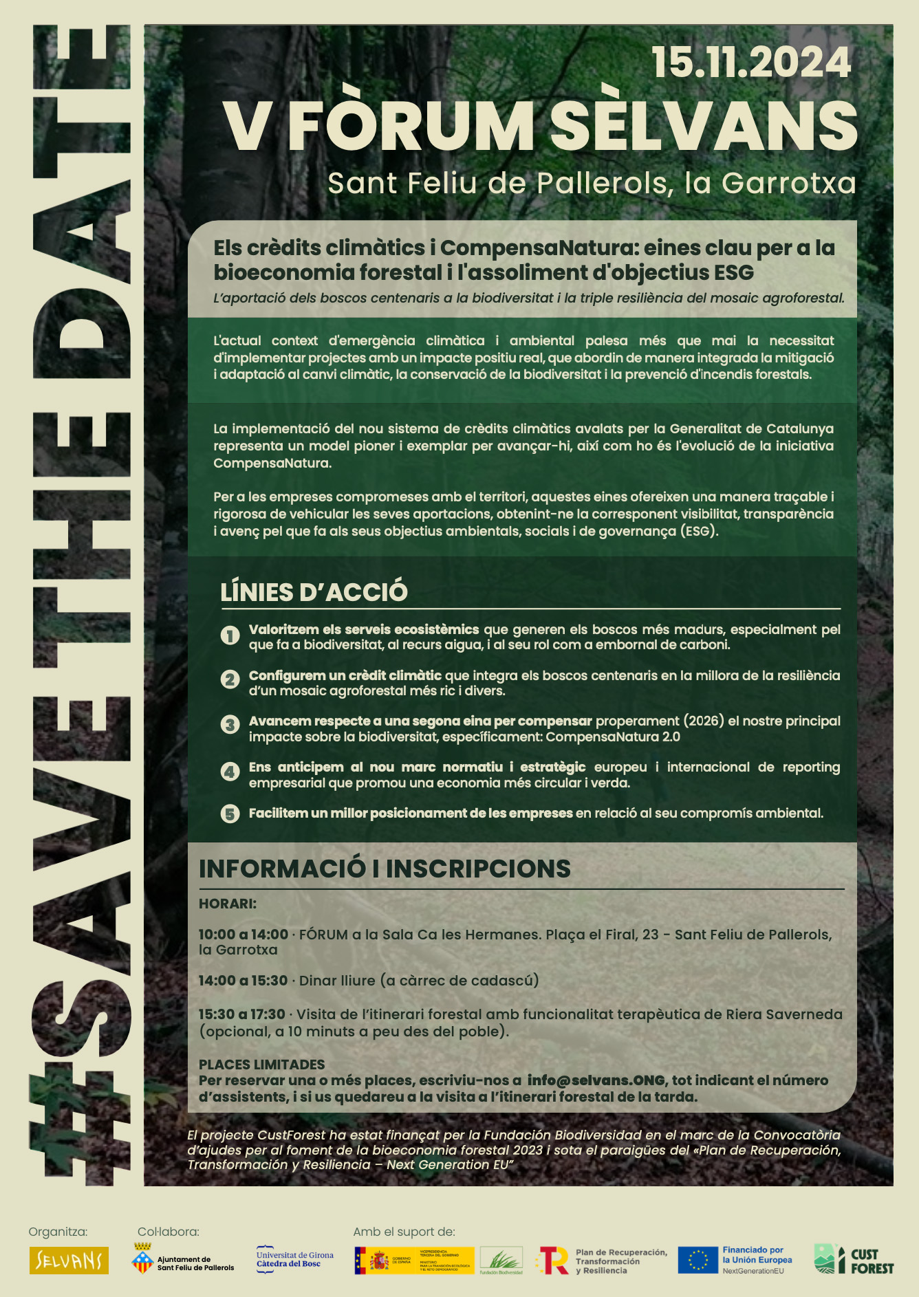 El V Fòrum Sèlvans tindrà lloc el 15 de novembre de 2024 a Sant Feliu de Pallerols, un esdeveniment on empreses, propietaris forestals, experts en medi ambient i entitats es reuniran per debatre i explorar solucions innovadores per a la mitigació del canvi climàtic i la conservació de la biodiversitat.